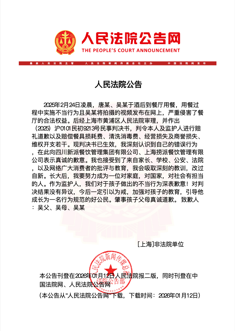中新网1月12日电(吴家驹)1月12日,通知布告网公开了“海底捞小便”事务另一当事人吴某及其父母的报歉声明。声较着示,2025年2月24日凌晨,唐某、吴某于酒后到餐厅用餐,用餐过程中实施不妥行为且吴某将拍摄的视频发布正在网上,严沉侵害了餐厅的权益。后经上海市黄浦区审理,判令本人及监护人进行赔礼报歉以及补偿餐具损花费、清洗消毒费、运营丧失及商誉丧失、开支若干。现已生效。吴某称,正在此向四川新派餐饮办理集团无限公司、上海捞派餐饮办理无限公司暗示热诚的歉意,也接遭到了来自家长、学校、、法院,以及收集泛博消费者的取教育,会吸收深刻的教训,。